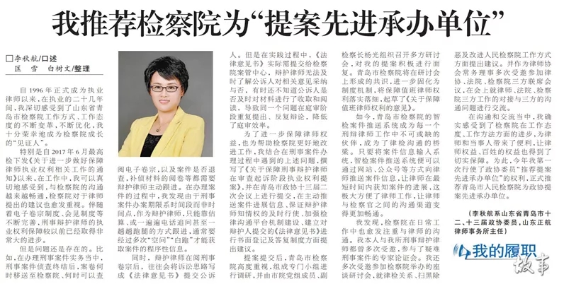 在沟通和交流当中,我确实感受到了检察院在工作态度、工作方法方面的进步,为律师和当事人带来了便利,让律师权益、百姓的权益也得到了切实保障。为此,今年我第一次行使了政协委员“推荐提案先进承办单位”的权利,正式推荐青岛市人民检察院为政协提案先进承办单位。